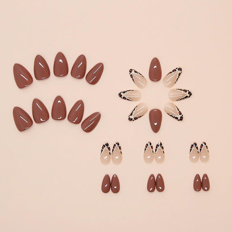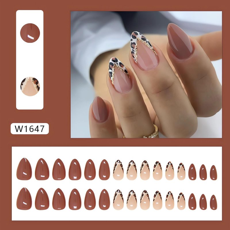 LPOODDNU Almond Press on Nails Medium Brown Fake Nails Cute Leopard Design French False Nail Tips Glossy Fall Nail Art Decorations Cute V Shape French Glue on Nails Almond Stick on Nails for Women