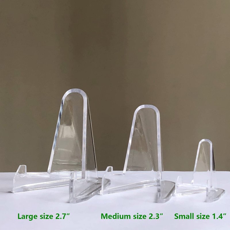 Our sports card stand in 3 sizes: large, medium, small. Made of high-quality acrylic, clear design looks beautiful, small size and light weight, easy storage and carry. Perfectly hold coins, table cards, business cards, mobile phone, frames, medallions, shells, belt buckle, CDs, small plaques, art works, collections etc....