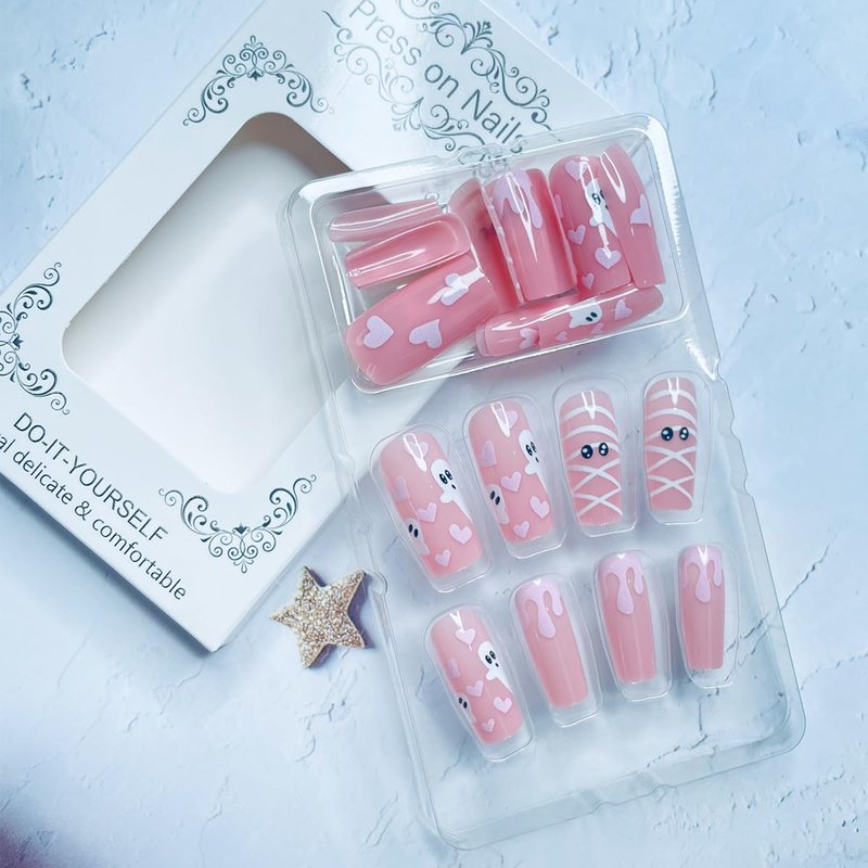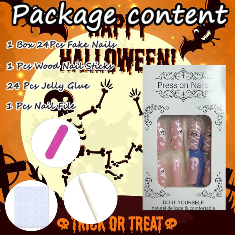 - Easy to Use: Reusable Halloween cute ghost press on nails kits with glue sticker can get your favorite manicure in just 5 minutes without waiting at the nail salon. Some simple steps allow you to get the same impressive professional effect at home