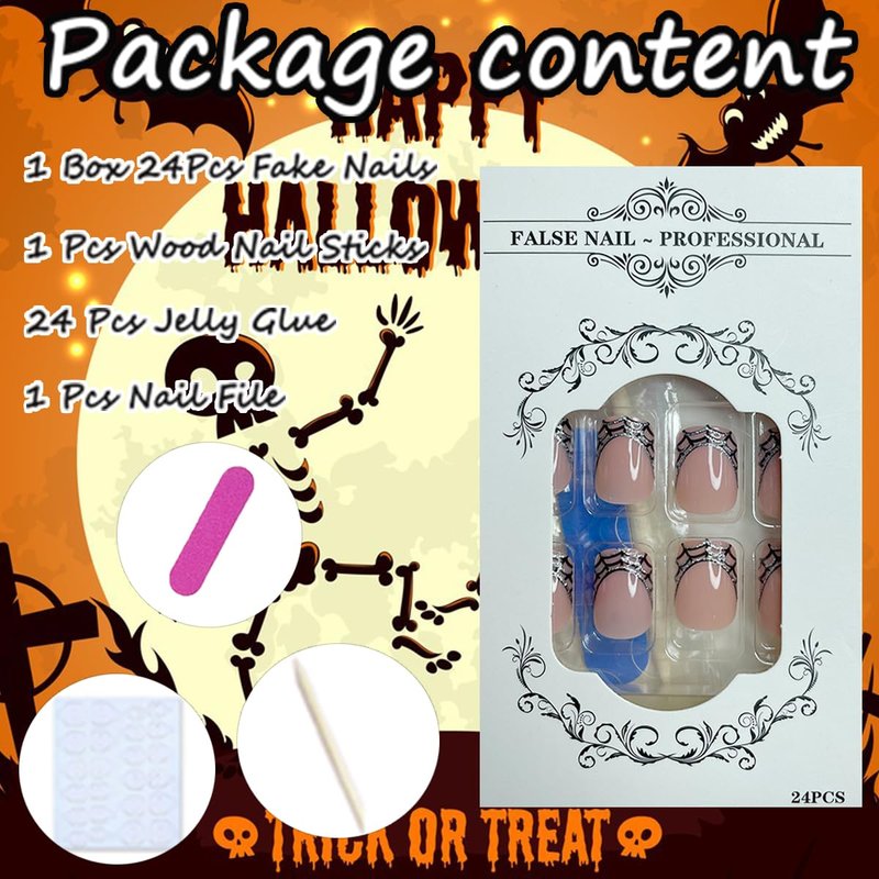 - Halloween Nails Kit: You will get 24 pcs Halloween press on nails, 1 pcs nail file, 24 pcs jelly glue sticker, 1 pcs wooden stick for removing false nails.Jelly glue is not as durable as liquid glue, but it makes fake nails reusable. Please use suitable glue according to different scenes