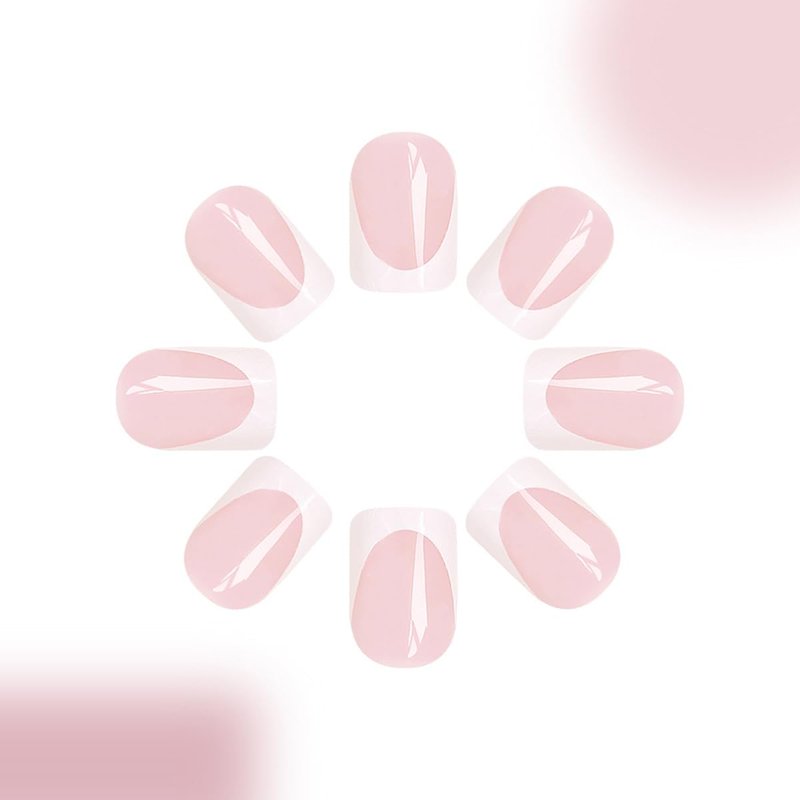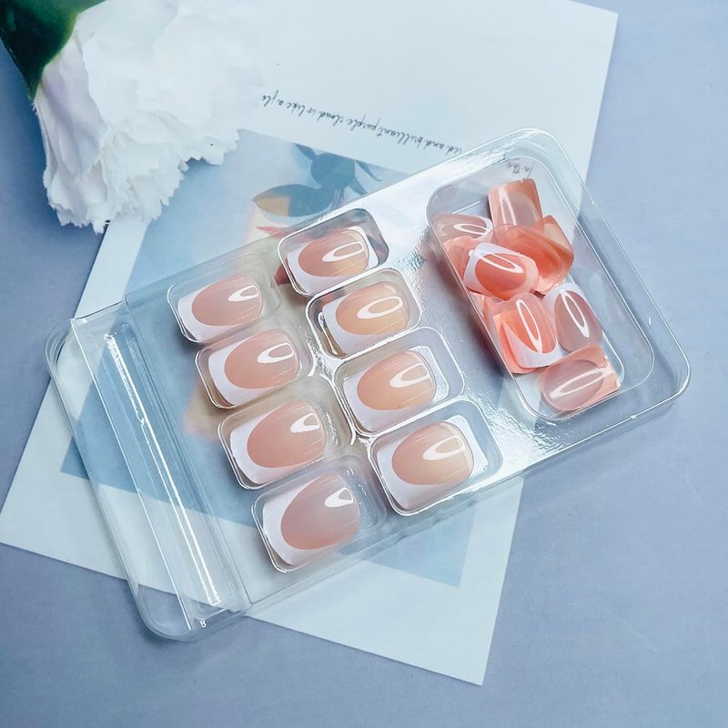 - Package Contents- 24 Pcs Short french tip press on Nails +1 Nail File + 24 Pcs Jelly Glue Stickers+1 wooden stick.(Durability of jelly glue is not as good as liquid glue, but it makes fake nails reusable. Please use suitable glue according to different scenes)