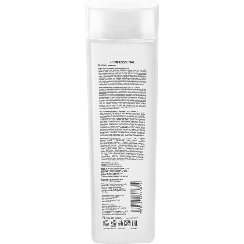 DEEP CLEANING HAIR SHAMPOO. Helps eliminating the accumulation of fat, cosmetic residues, chlorine and minerals on the hair. The recomendation is tu use it before applying a treatment or after decoloration.