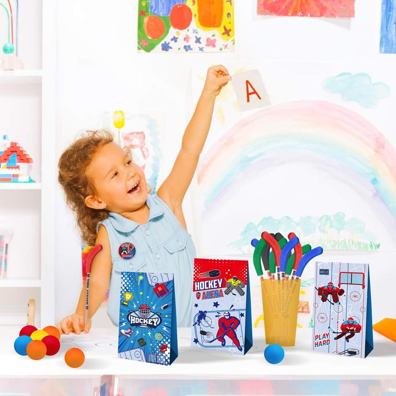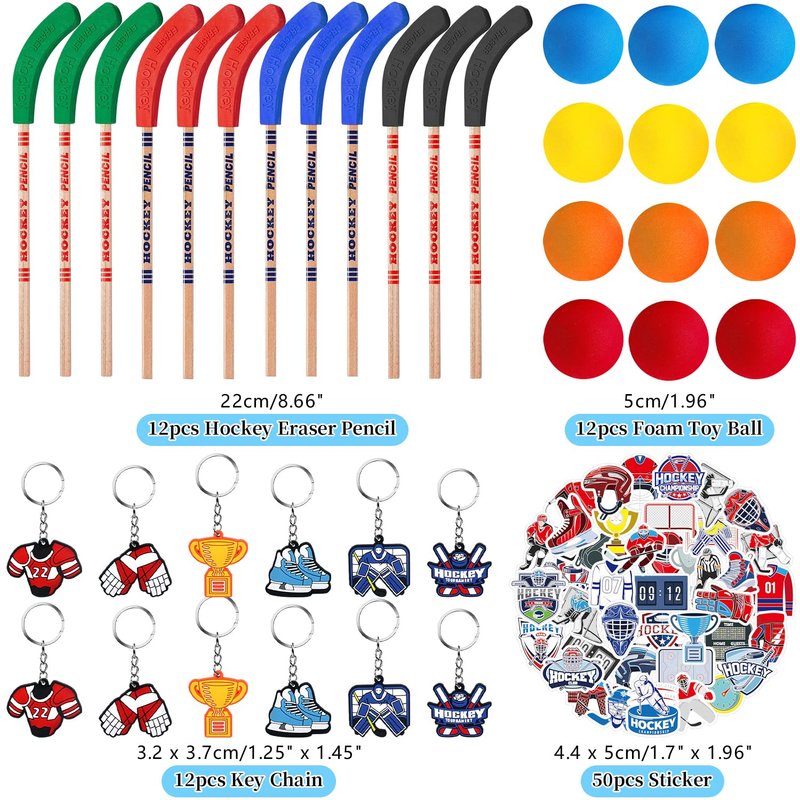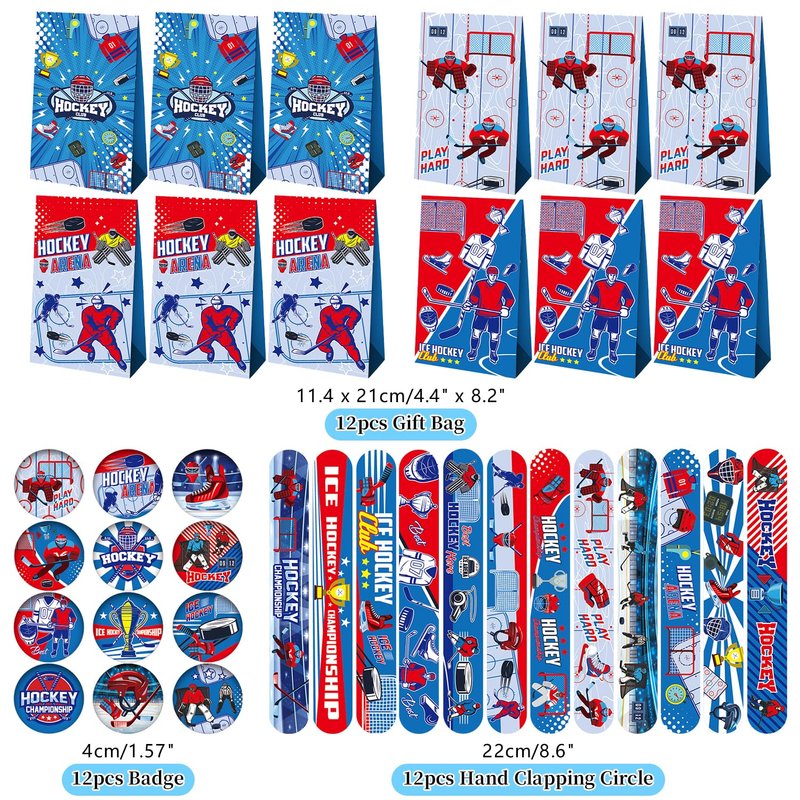 - You Will Get: You will get a total of 113 pieces of ice hockey party favors, including 41 sheets of hockey theme stickers, 12 hockey goodie bags with 4 styles, 12 hockey button badges with 12 styles, 12 hockey slap bracelets with 12 styles, 12 knee hockey balls with 4 different colors, 12 hockey pencils in 4 different colors, 12 hockey keychains with 12 styles; enough quantity and cool styles can meet your needs for various kinds of ice hockey parties.