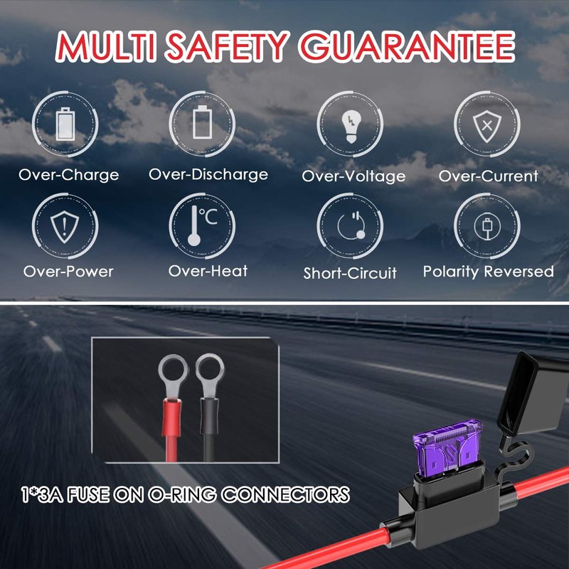 - √ Safety Guarantee - Multi protection against Reverse polarity/ Short Circuit/ Over Voltage/ Over Current/ Overload/ Overheat; Spark proof during lead connection; Water and dust resistant float charger, full-loaded and burn-in test proves its stable performance and high reliability.