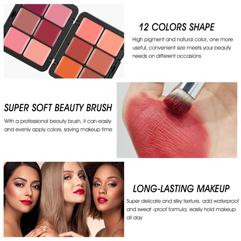 LSxia 12 Colors Cream [Blush] Makeup Palette for Cheeks - Multi-functional Blush Makeup Palette with Brush, Natural Matte Long Wearing, Waterproof Blendable Face Makeup Palette (#01)
