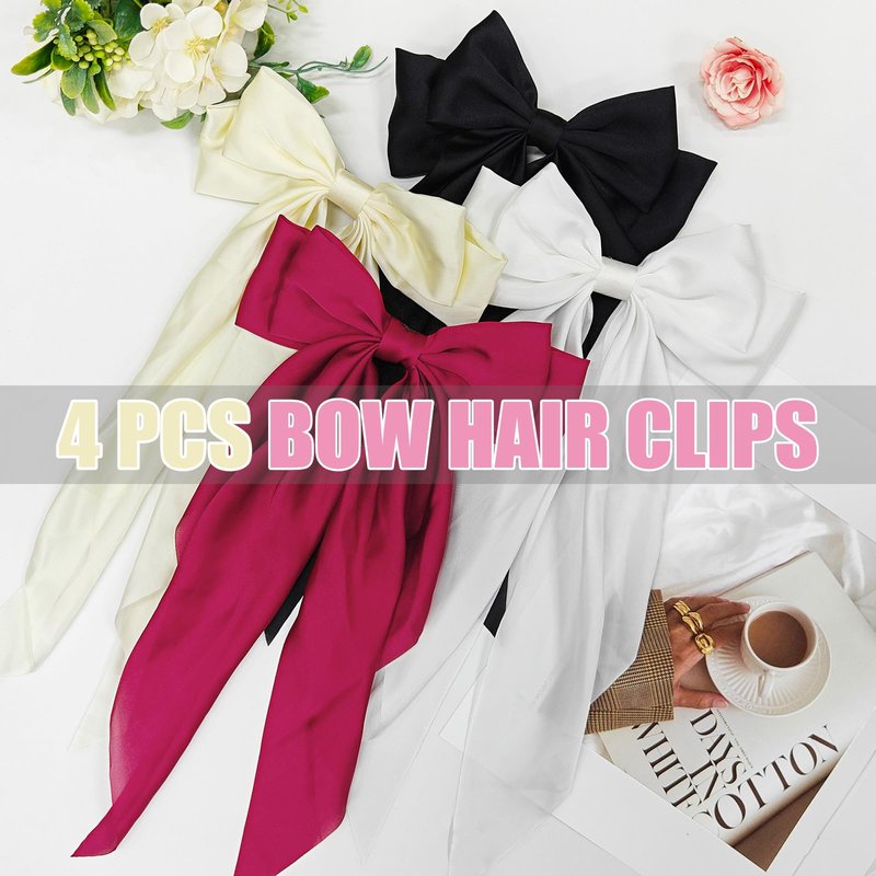 LSxia 4PCS Hair Bows for Women, [Black & White & Beige White & Wine Red] Hair Bows for Hair, Big Silky Satin Hair Bow Hair Ribbons, Bow Hair Clips Bow Clips for Women, Cute Hair Accessories (Set G)