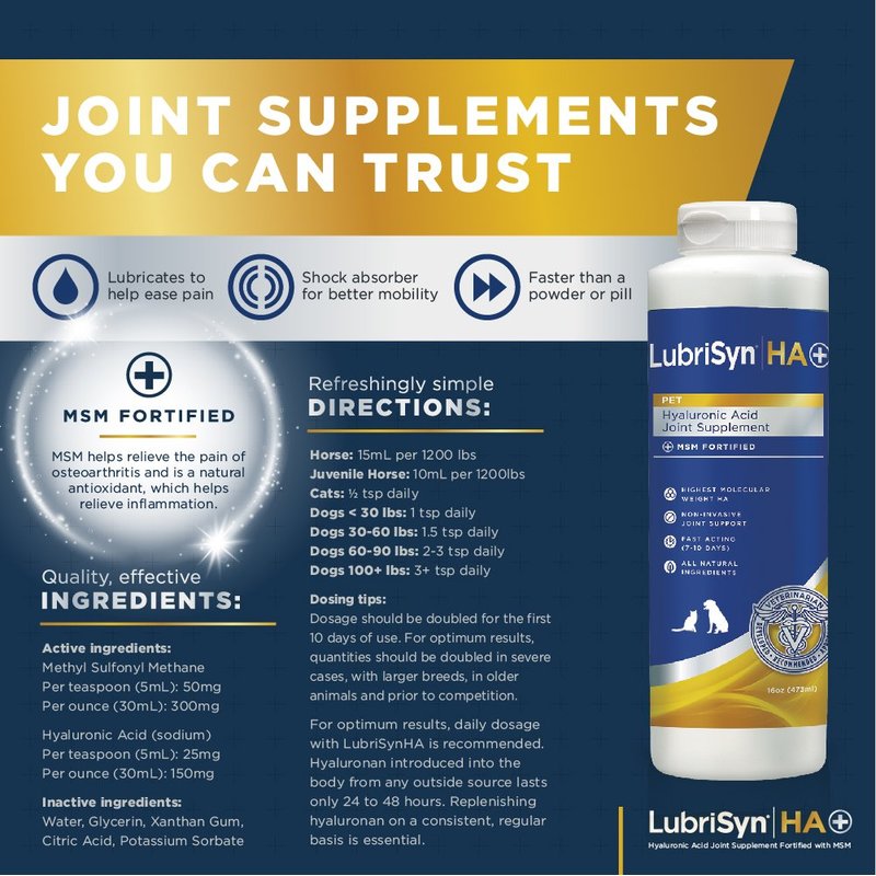 LubriSyn Hyaluronic Acid + MSM Joints Supplement, 16oz: Natural Pure HA Liquid Dog and Cat Joint & Cartilage Support, Relief, and Lubrication for Pets Including Dogs, Cats and Horses, Vegan Formula