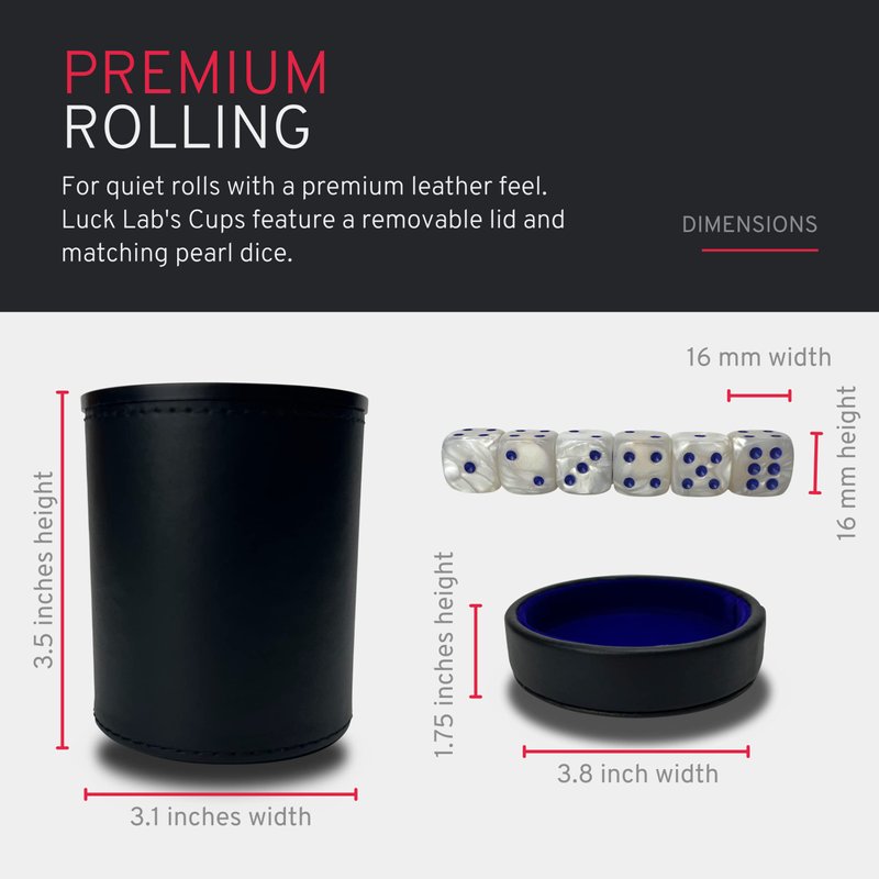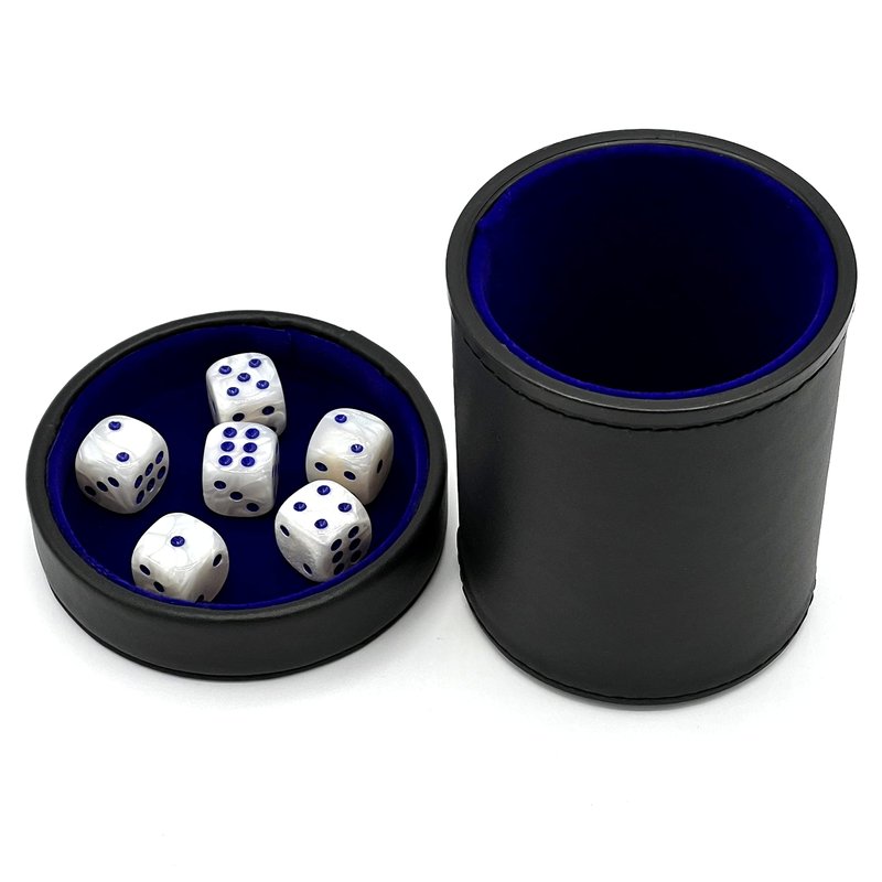Luck Lab Black Leather Dice Cup with Lid Including 6 Matching Pearl Dice - Blue Velvet Interior for Quiet Shaking - Use for Liars Dice Farkle Yahtzee Board Games, Black