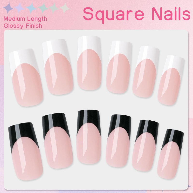 - Convenience:Our french press on nails square simply press-on and go.No need professional assistance and just apply for base coat then cure finish.Medium length square press on nails provide a quick and easy solution for manicure at home. Fake nails avoid the time and cost of salon visits. Square press on nails go on quickly with adhesive tabs and come off easily without residue when ready. No soaking or nail damage is required.Our fake nails fit for any occasions to show off your style!