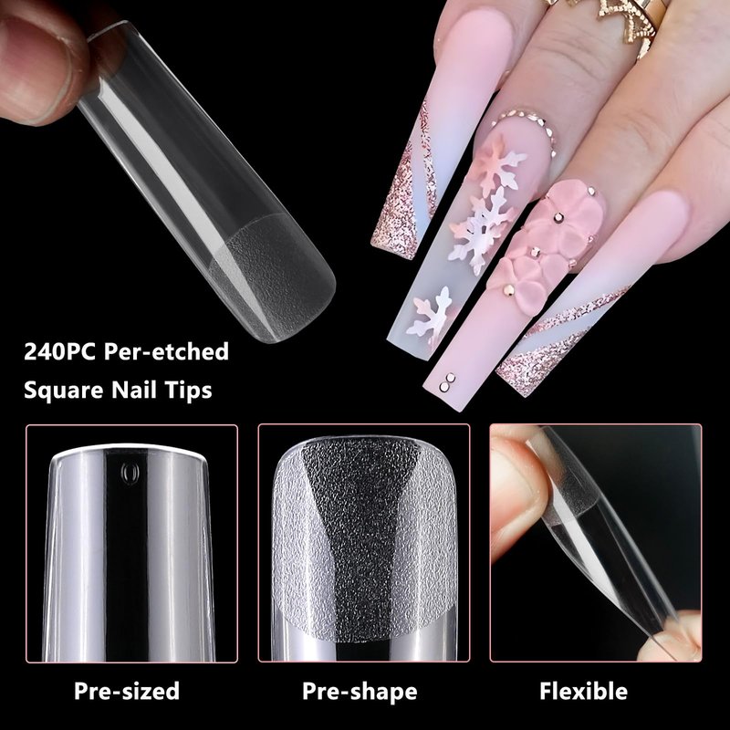 LuckForever 240pc XL Square Gel X Nail Tips Clear Fake Nails Extra Long Square Nail Tips Full Cover Artificial Fingernails XL Soft Gel False Nail Tips for Acrylic Nail Extension Press on Nail Making
