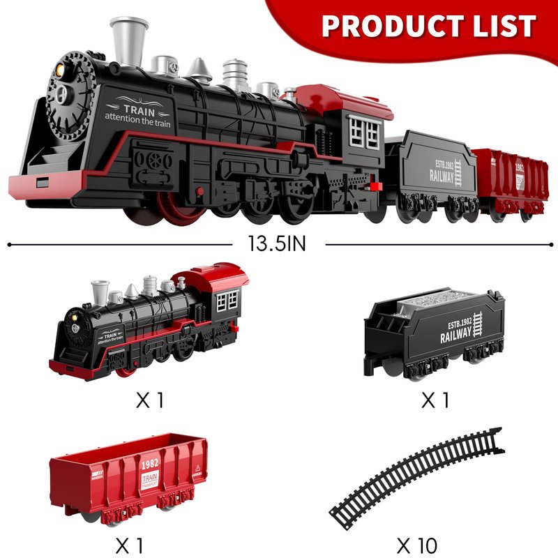 - Retro Christmas Train Sets Toys For Kids: This classic electric train set toys features a retro design that reflects the charm of traditional trains. It includes a battery-powered locomotive, a freight carriage, a coal carriage and 10 tracks, all of which are exquisitely detailed and can attract children's attention. Children can freely combine and build different track shapes according to their creativity and imagination, enriching their playtime experiences with endless possibilities.