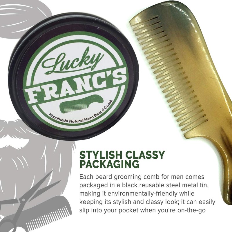 Get your facial hair immaculately groomed with the Lucky Franc's Beard and Moustache Comb for Men. Exclusively handmade with the natural ox or bull horn and elegantly presented in a classic metal tin, this beard and mustache grooming kit will tackle your styling challenges while looking stylish and uniquely one of a kind.
