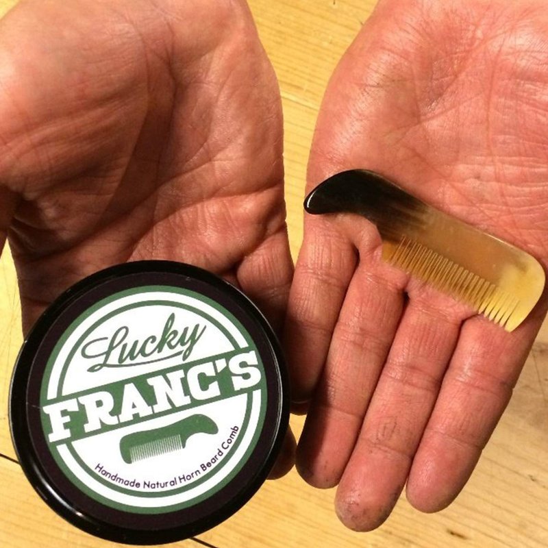 Lucky Franc's Real Horn Handmade Beard Comb for Men. Detangling Static-Free Fine Tooth Comb for Mustaches and Beards. Gift for Men. Pocket Size Moustache Comb in Metal Tin. Ox Horn Comb