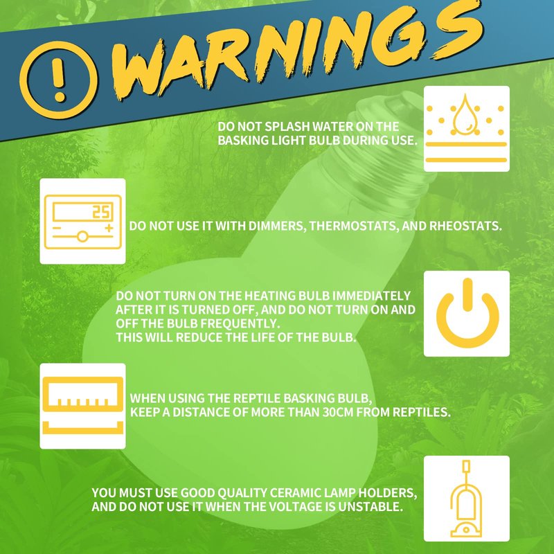 - 🦎SAFETY INSTRUCTIONS - You must use good quality ceramic lamp holders, and do not use it when the voltage is unstable. Do not use it with dimmers, thermostats, and rheostats. Do not splash water on the basking light bulb during use. When using the reptile basking bulb, keep a distance of more than 30cm from reptiles. Do not turn on the heat bulb immediately after turning it off, and do not turn the bulb on and off frequently.