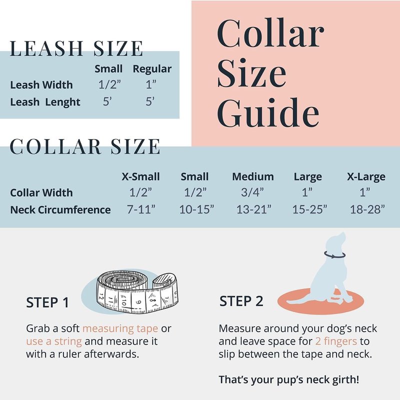 - LOOKING FOR A MATCHING COLLAR+LEASH SET TO USE ON WALKS? We’ve got you covered. And you’re going to love the bright, colorful options! Our beautiful collars have matching leashes that are perfect for dog walking and hiking. Leashes are 5 feet long, with a comfortable, soft hand loop that keeps you in control of your pooch. Leashes come in two widths and can be purchased separately.
