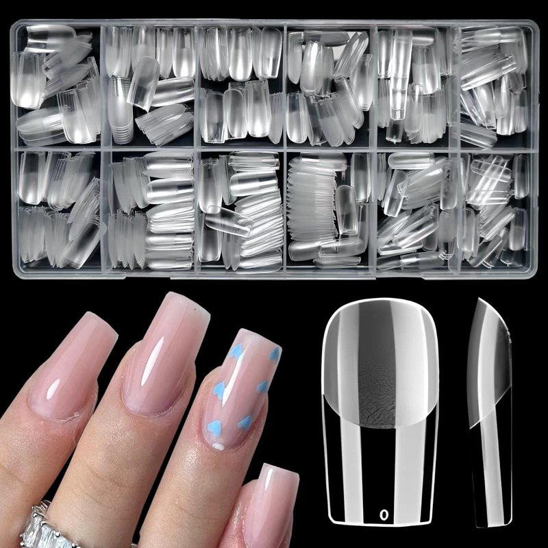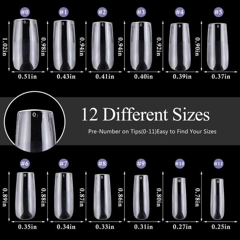 - Customized Full Nail Tips: Full cover clear square nails featured with 12 different sizes, 50pc square nail tips per size, total 600pc square tips for acrylic nails extension. Full size square false nail tips can fit for wide/flat/curve/small nail beds and large/narrow/medi/petite nails hand. Strong case package gel x nail tips kit are ready for nail gift giving to women and teen girls who love manicure.