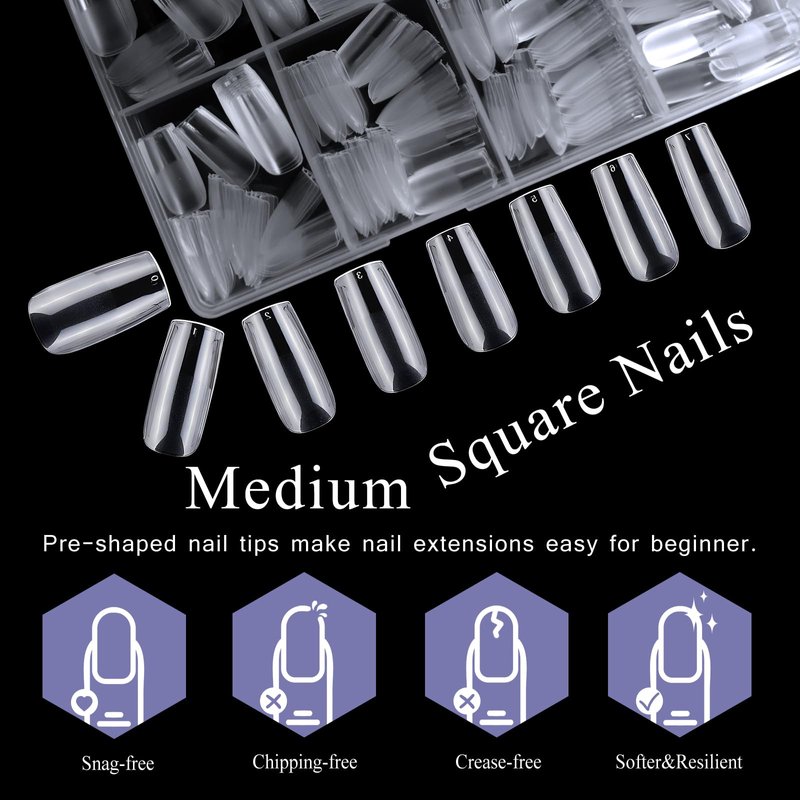 - Medium Length Gel x Nails for Versatility: Square gel x tips designed with medium length and full cover square shape. Square press on nails clear strikes the perfect balance between elegance and practicality. Medium long square nail tips for acrylic nails offer enough length to showcase nail art and designs while remaining manageable for everyday tasks, providing the best of both worlds.