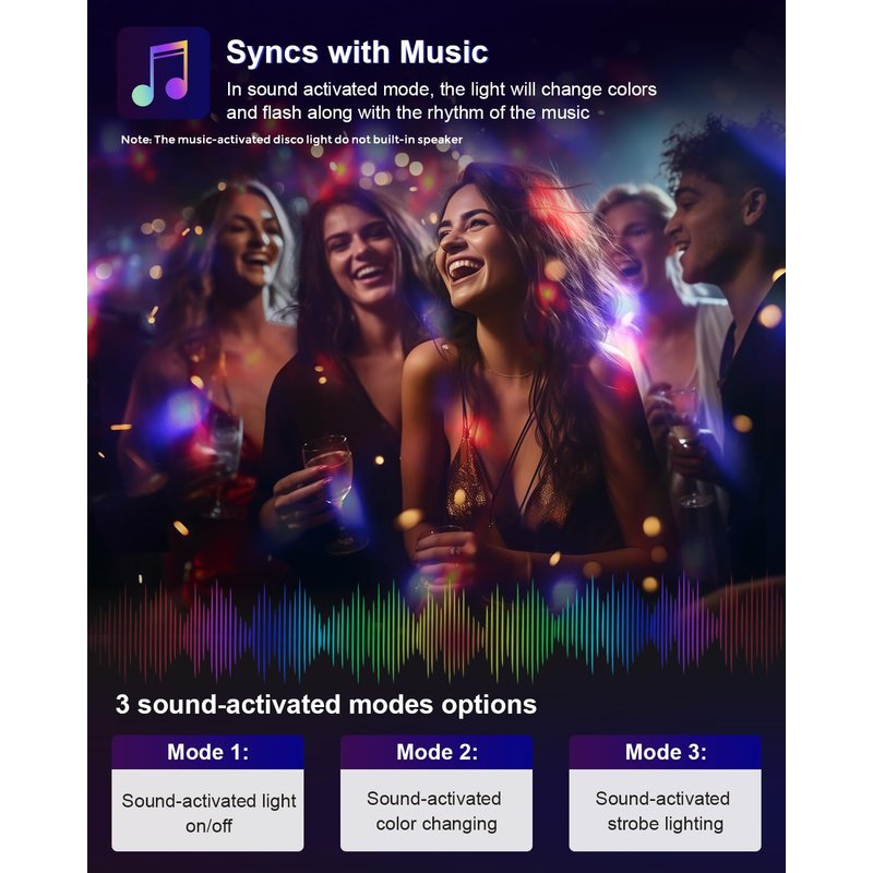- Multi-functional sound activated party lights: 3 sound-activated modes + 7 lighting modes + Rotating speed control