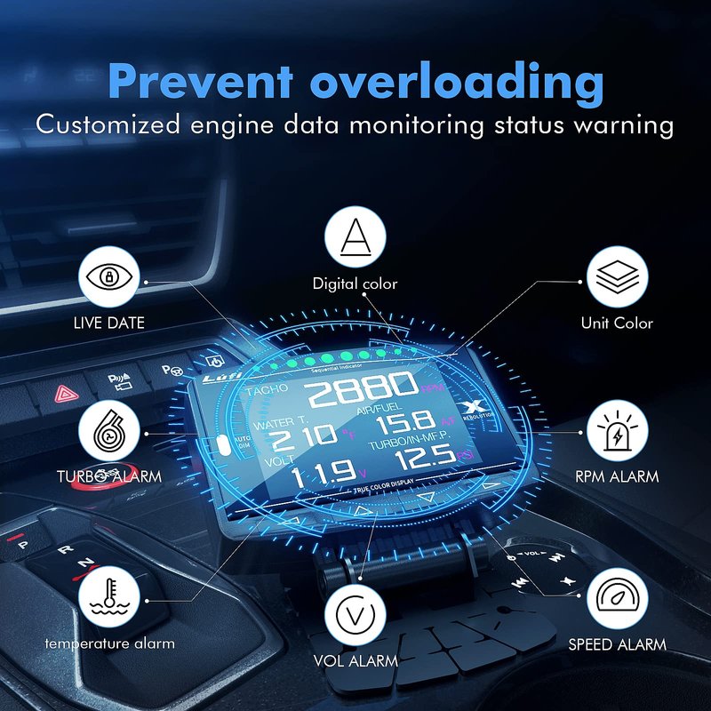 - SAFETY FIRST: ➤ More than 30 driving data (such as speed, RPM, water temperature, voltage, turbo pressure, etc.) will be displayed on the HUD display, and you can easily view every detailed data without looking down at the dashboard while driving, so as to prevent engine overload damage and protect vehicle and personnel safety