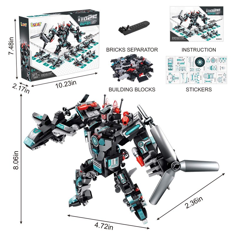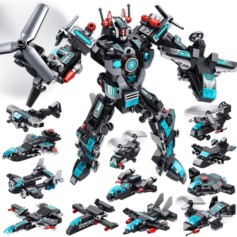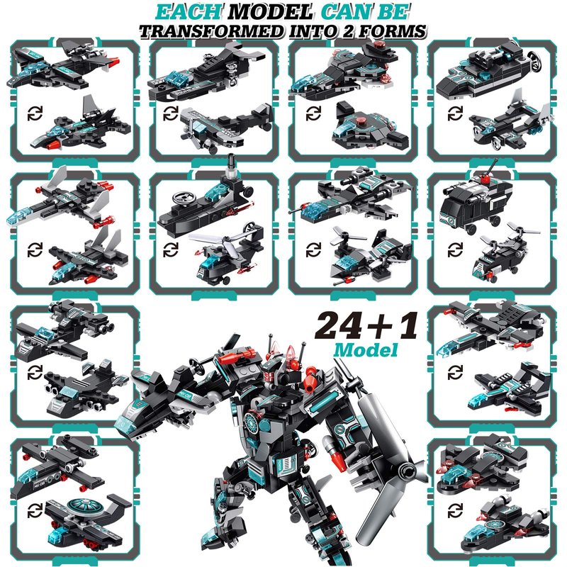 25-in-1 Construction Toy: LUKAT Building Bricks Set can build 12 different aircrafts and fighters while each has 2 forms. You can get 25 models in total(24 aircrafts or fighters and 1 transformer).