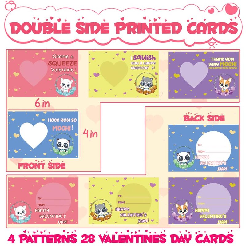 28 Packs Kawaii Animals Mochi Squishy Toys with Valentines Day Gift Cards