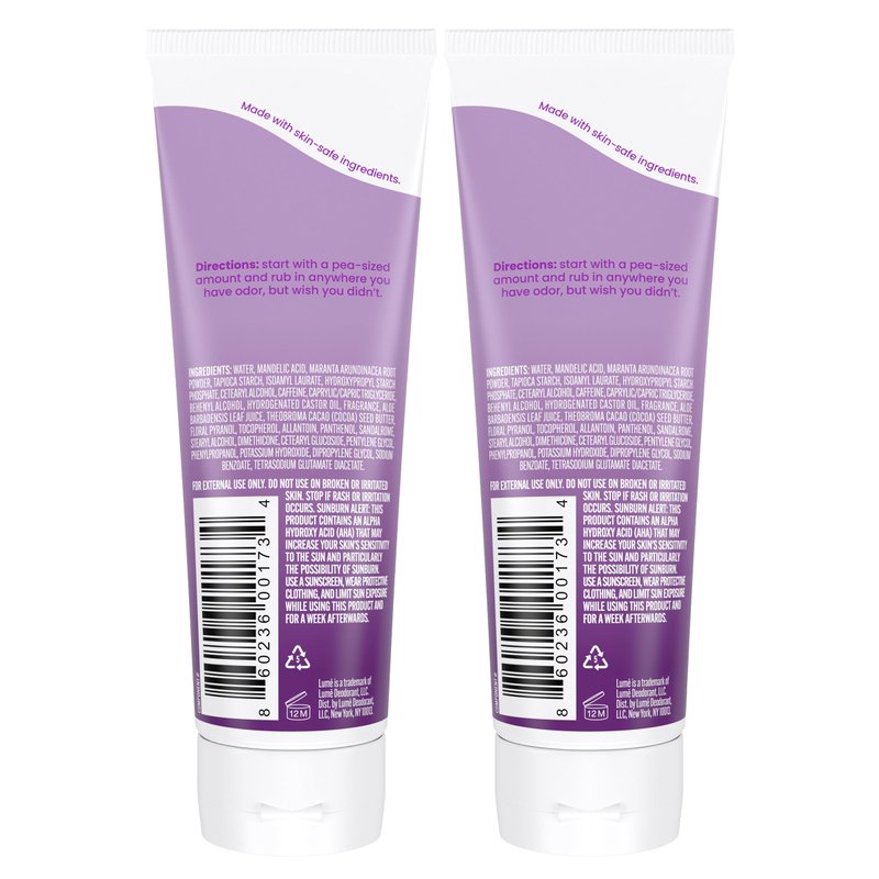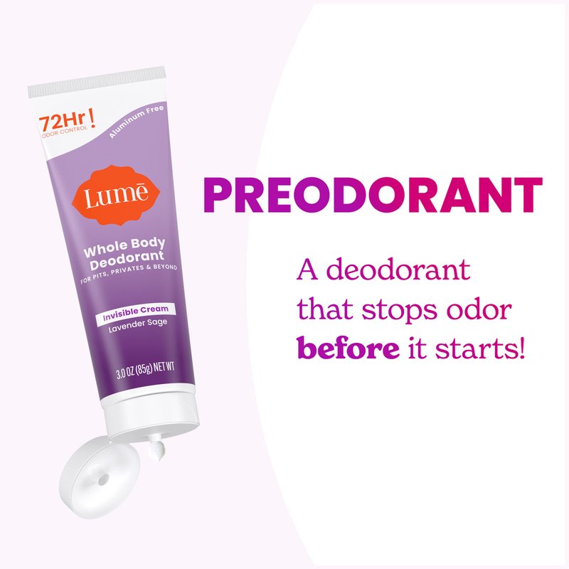 WORLD'S FIRST WHOLE BODY DEODORANT No fragrances or essential oils for those who prefer no added scents. Lume's travel friendly Invisible Cream Deodorant Tube allows you to easily control the amount you use. Use fingertips to swipe the dispensed cream on pits, privates or anywhere else you have odor but wish you didn't. Our water based formula won't stain your clothes and leaves no residue behind. Using the recommended pea-size amount, the tube will offer 150 underarm applications (two armpits) or 300 “anywhere else” uses. A little goes a long way.