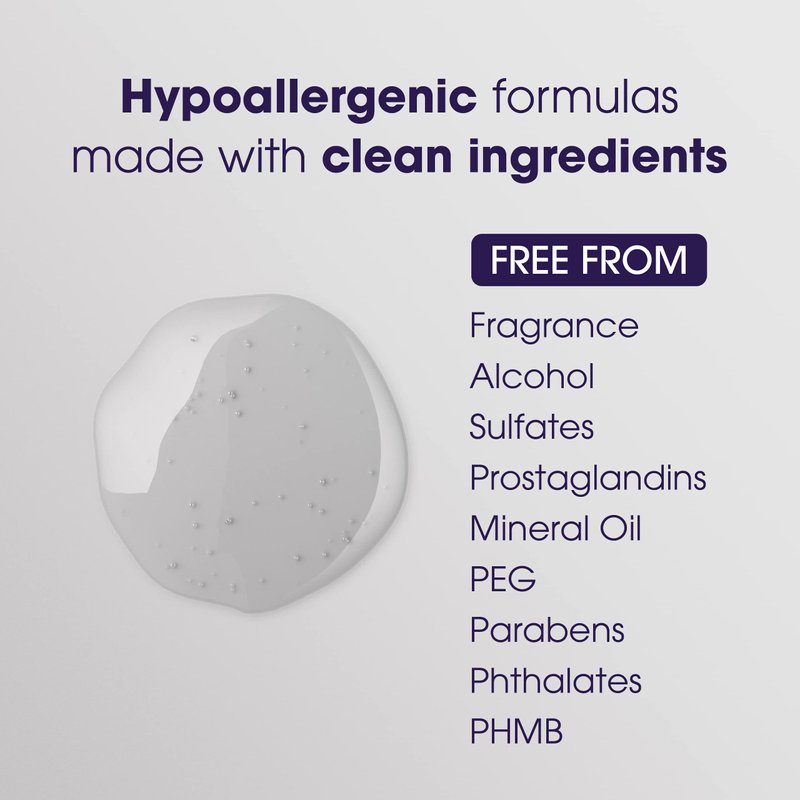 - CLEAN INGREDIENTS: This hypoallergenic formula is free of fragrance, alcohol, sulfates, mineral oil, PEG, parabens, phthalates, PHMB.
