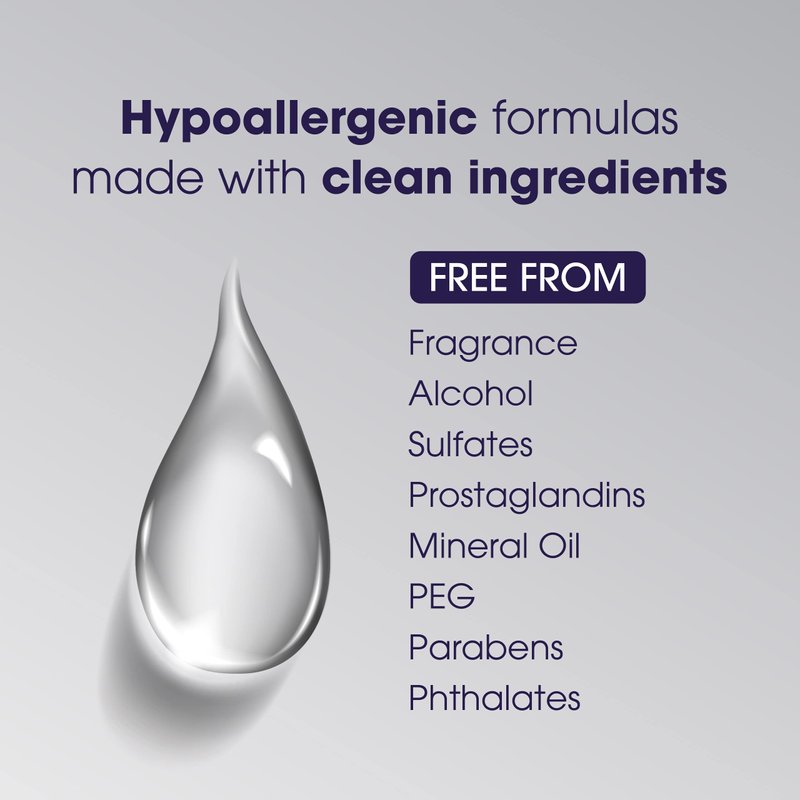 - CLEAN INGREDIENTS: This hypoallergenic formula is free of fragrance, alcohol, sulfates, prostaglandins, mineral oil, PEG, parabens, or phthalates.