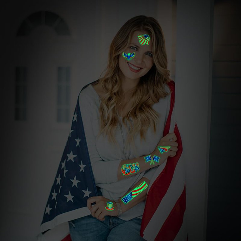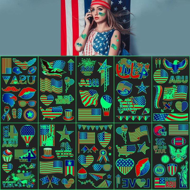 - - Content: includes 10Sheets glow tattoos measuring 4.8in*2.7in, making them perfect party accessories for 4th of July celebrations.