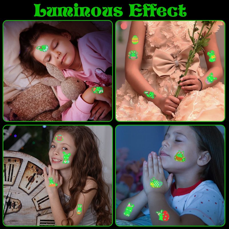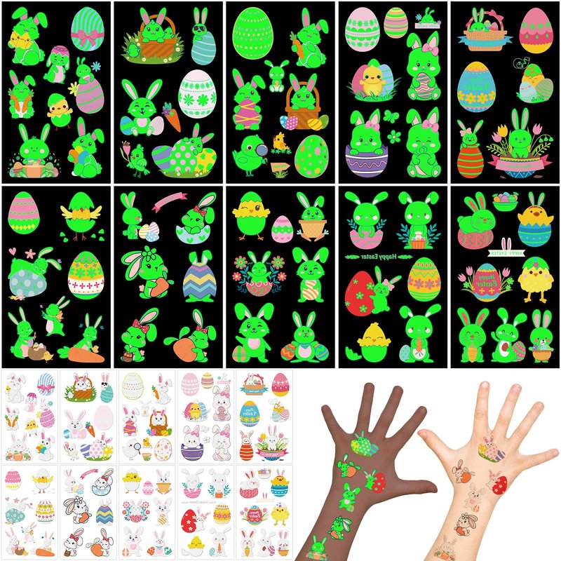 - 🐇Easter fake tattoos : This is a gift specially prepared for Easter day. These 10 glow in the dark tattoos for kids can be used as fillers for Easter baskets, with the size shown in the picture.