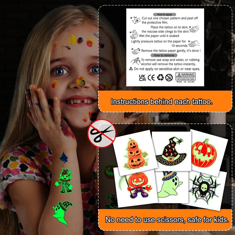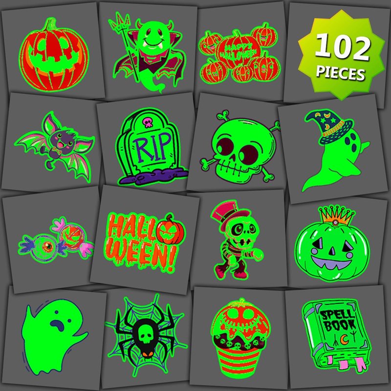 - 【Glow in Dark Temporary Tattoos】102 PCS Halloween tattoos for kids/adults in various unique fun and spooky designs, such as ghosts, bats, witches, spiders, black cats, tombstones, and castles. TIPS: Luminous tattoos need to be activated under light for a few minutes to get more luminous effect.
