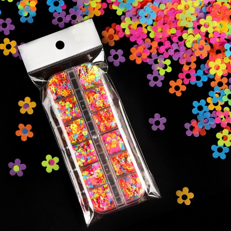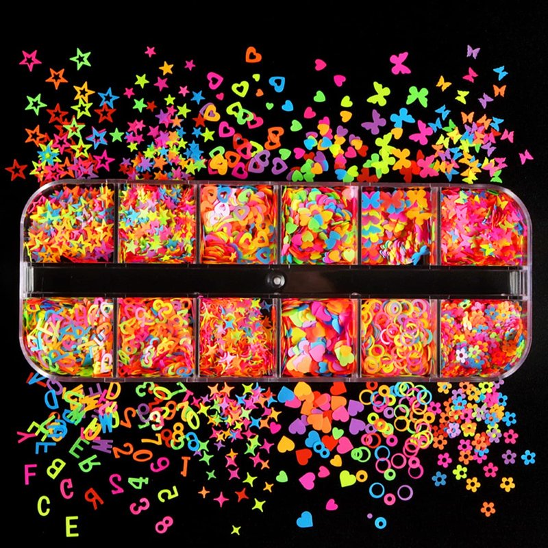 - 【Quantity】12 Grids fluorescent nail art sequins, Design of mixed pattern colors, Contains a variety of patterns: Hollow Five-Pointed Star, Five-Pointed Star, Four-Pointed Star, Small Love Heart, Big Love Heart, Hollow Love Heart, Alphabet, Numbers, Circle, Small Butterflies, Big Butterflies, Flowers.