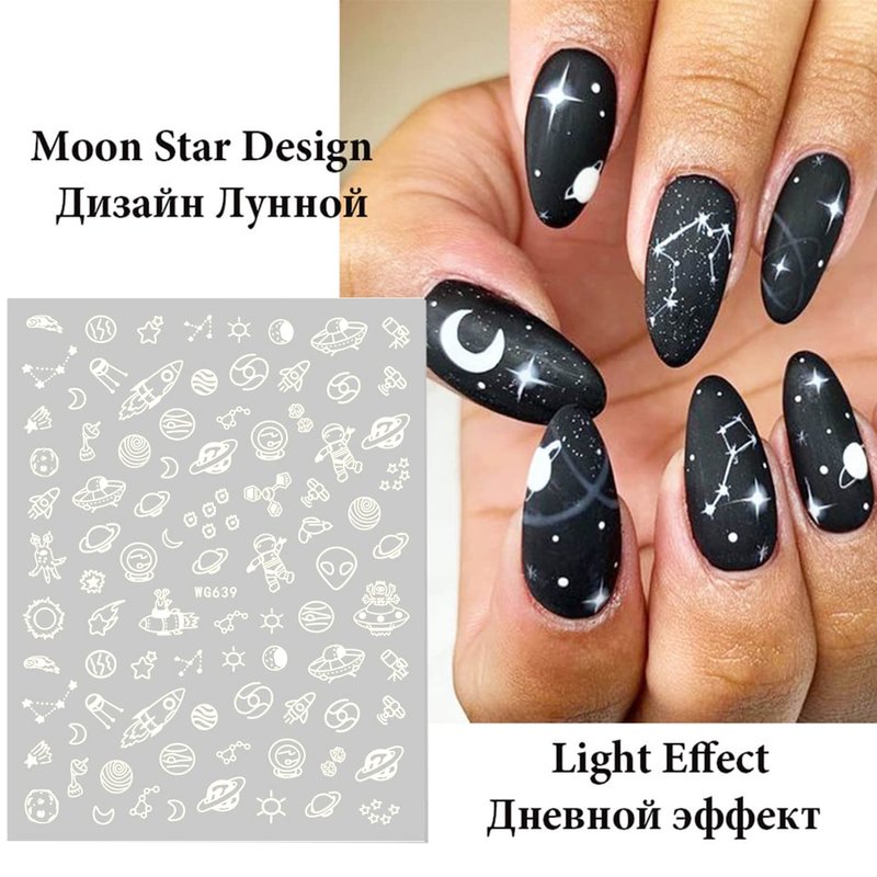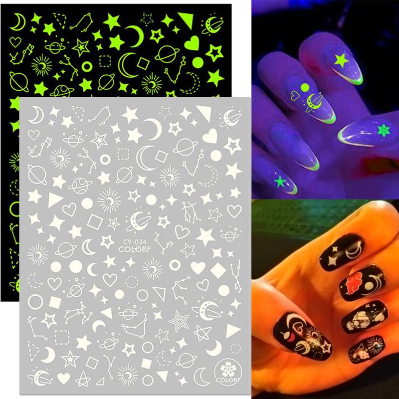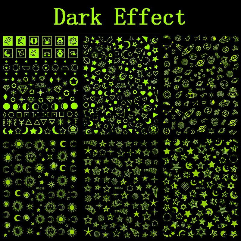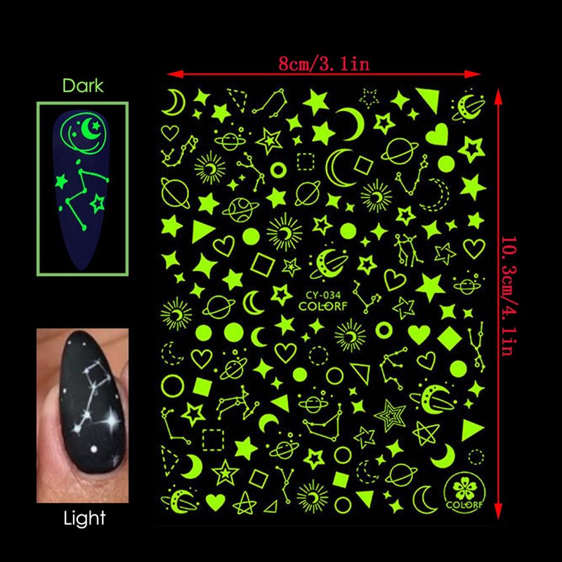 - Quantity: 6 Sheets luminous nail art adhesive sticker 3D nail art design, each paper measure 4.1 x 3.1 inches(10.3 x 8cm). Contains a variety of patterns: Sun, Moon, Stars, Love Heart, Diamond, Constellation, Rocket, Astronaut, UFO etc. You have more choices to complete your own nail art.