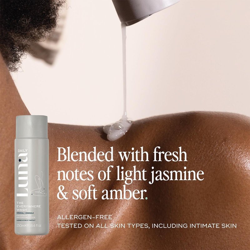 Many body washes contain harsh chemicals that disrupt our natural pH balance and irritate our intimate areas, but why should you have to use a separate wash? This travel-size, and sensitive body wash is powered by Luna Daily’s THERMA-BIOME+ complex, which includes thermal water, prebiotic lactic acid, and inulin, along with vitamins C, E, and F to support, nurture, and protect your skin microbiome. Expertly developed with dermatologists and gynecologists, this gentle cleanser contains zero percent soap, is vegan, pH balanced, and includes soothing aloe vera, chamomile extract, and coconut oil. Our moisturizing, foaming shower gel is hypoallergenic and formulated specifically for sensitive skin, without parabens, sulfates, or cruelty. This hydrating body wash provides daily care for women, ensuring your skin remains clean, non-irritating, and balanced. Ideal for very private and intimate areas, it’s perfect for all skin types, including dry and sensitive skin. Made with Luna Daily’s original signature scent: fresh notes of light jasmine and soft amber.