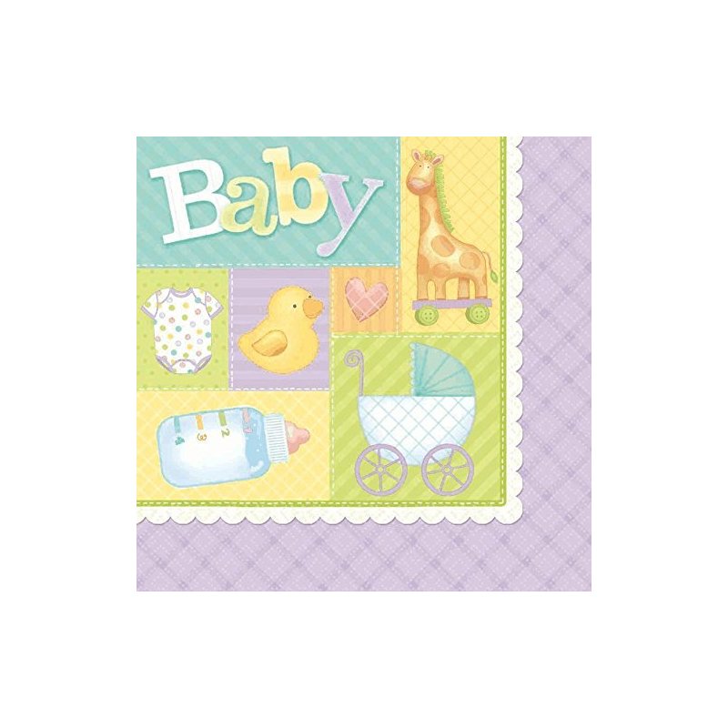 Add our Pastel Patchwork Luncheon Napkins to your baby shower tables! Each napkin features a purple patterned border with baby themed images. Measures 6.5" x 6.5". Includes 16 - 2 ply paper napkins per package.