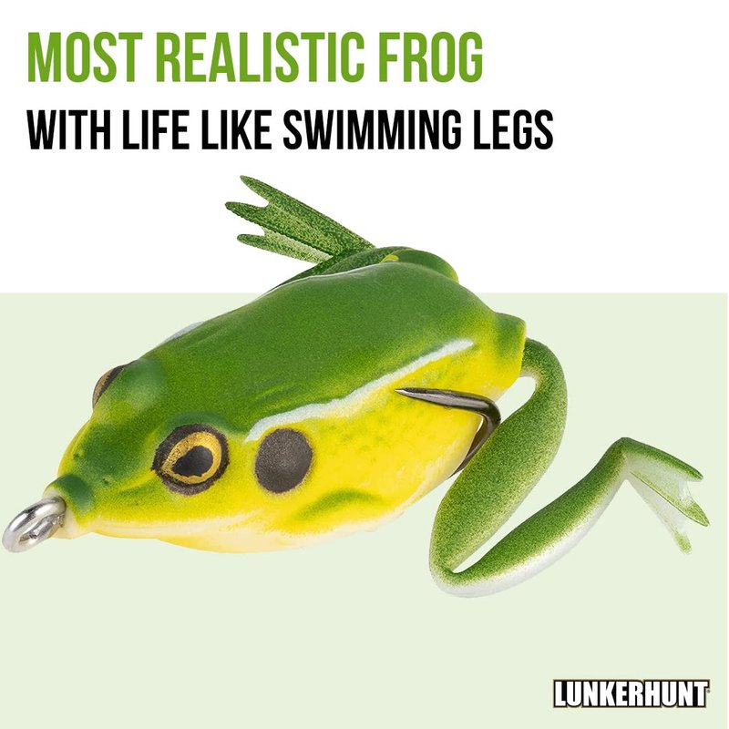 - ✅ the SWIMMING LEGS MAKES this fishing frog lure SO REAL. The LEGS EXTEND & RETRACT that replicates like a LIFE FROG. This frog fishing lure has swimming legs that extend during the retrieve and retract on the pause. At rest, the Lunker Frog is 1.75 inches and will extend to 2.5 inches on the retrieve.