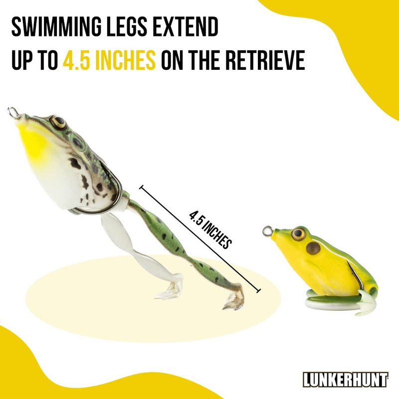 - ✅ AWARD WINNING frog lure by ICAST- BEST top water frog lure with SWIMMING LEGS that makes this frog lure SO UNIQUE. The LEGS EXTEND & RETRACT that replicates like a LIFE FROG. This frog fishing lure has swimming legs that extend during the retrieve and retract on the pause. At rest, the Lunker Frog is 2.25 inches and will extend to 4.5 inches on the retrieve.