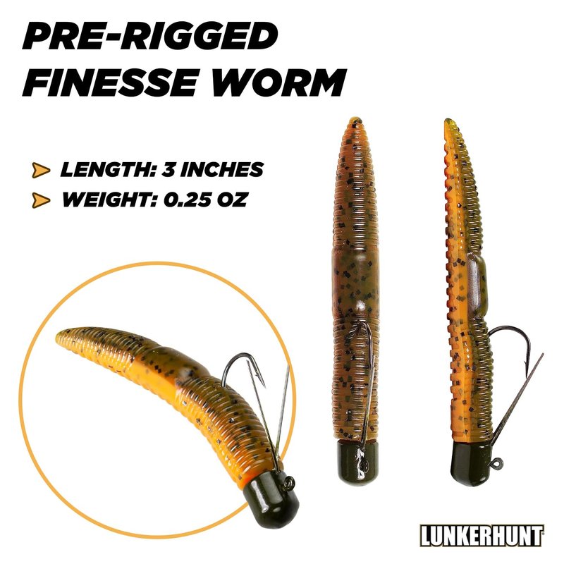 - ✅ WEEDLESS LURE: The Lunkerhunt Pre-Rigged Finesse Worm is a clean and simple fishing lure that consistently puts fish in the boat, even when it seems they just don’t want to bite. It’s a weedless lure that fish simply can’t resist