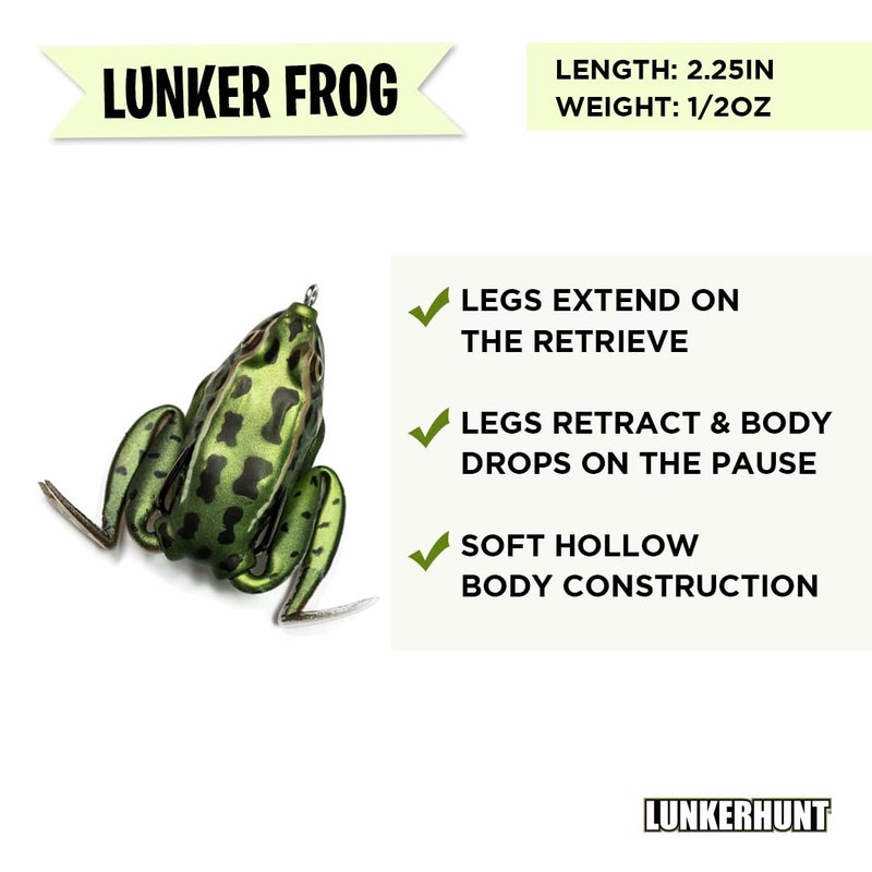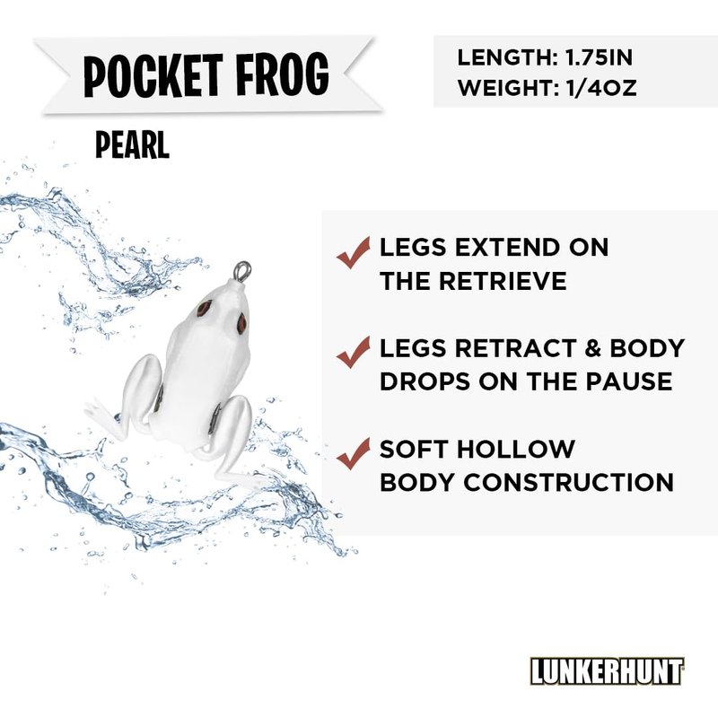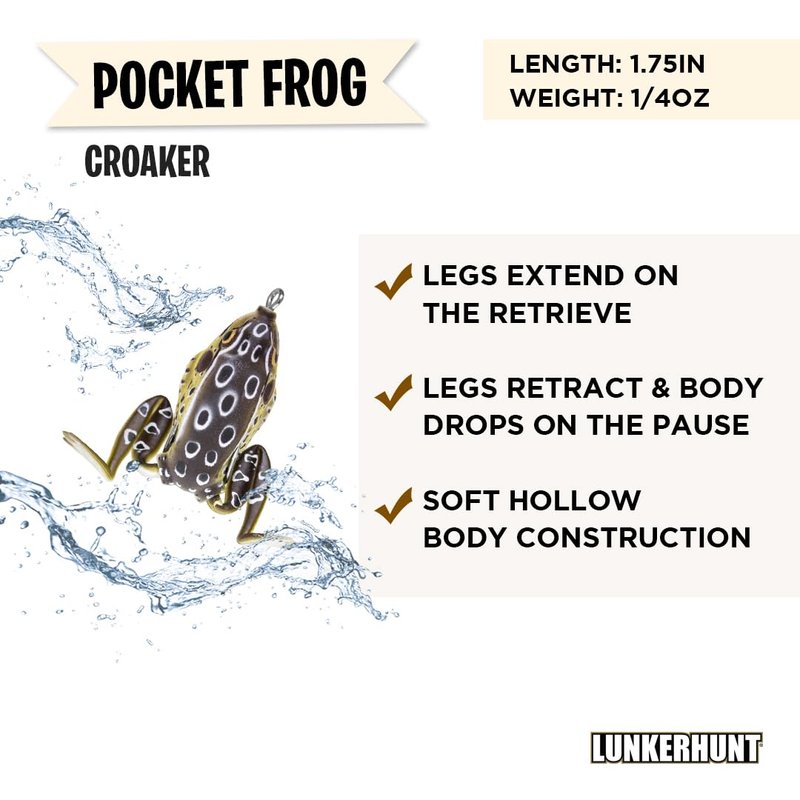 - ✅ DURABLE and HIGHEST QUALITY CONSTRUCTION: The Pocket Frog features high quality components, a super soft hollow body construction, a weedless design and a high quality finish. Look no further. Get your LUNKERHUNT Fishing Lure today!