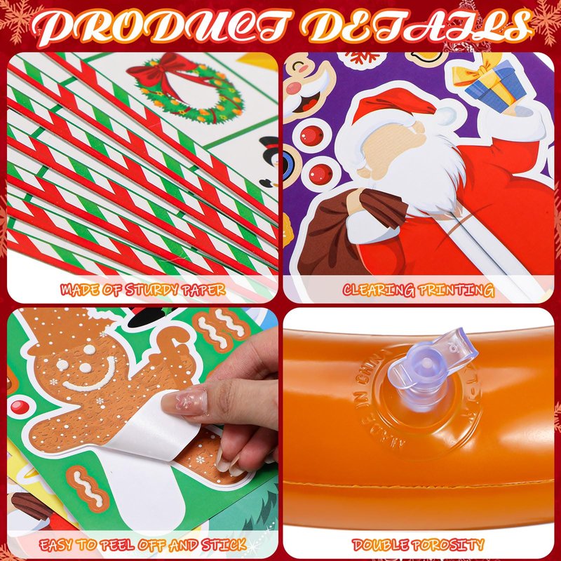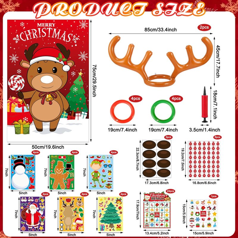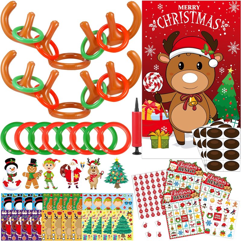 - Package Includes: the Christmas party games set includes 24 pcs make your own Christmas stickers, 2 sets of inflatable reindeer antler ring toss games (including 2 antlers, 8 rings and 1 inflator), 1 set of 24 players bingo game (including 24 bingo cards, 1 calling card and 6 identification cards) and 1 set of pin game (including 1 poster and 3 sheets of nose stickers); 4 interesting Christmas games meet your kids and families' need to have a good time together and have a merry Christmas