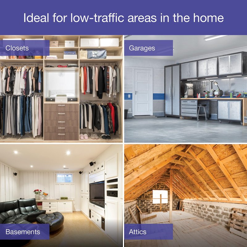 - Ensure lights are never left on for a long period of time in low-traffic areas in the home such as closets, attics, basements, and garages