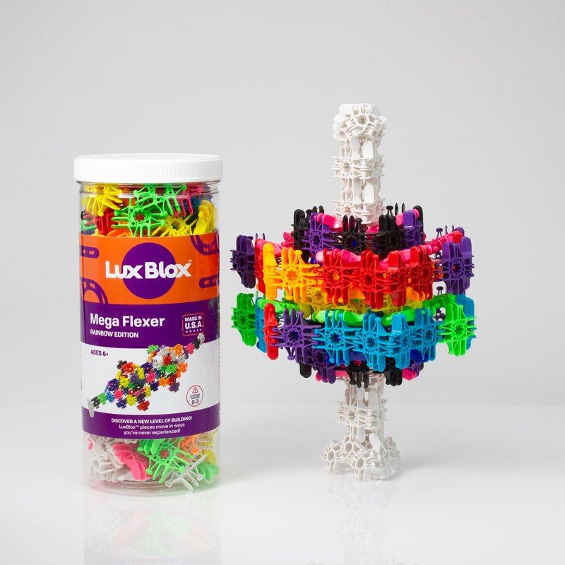 We are excited to offer the super-sized Mega Flexer, in bright rainbow colors! With amazing motion and a satisfying “click” sound Keep kids focused and flex their minds as they contemplate the unique building experience Makes a unique accordion-like structure which is satisfyingly awesome to squish and expand 143 pieces in mesmerizing neon rainbow colors The Flexer is 22" long and approximately 7" wide Recommended for builders age 6 and up