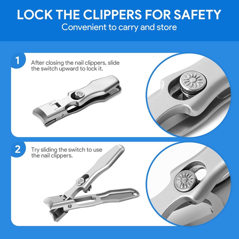 - 【Anti-Splash & Safety Lock Design】 Designed with an anti-splash nail catcher, these clippers keep your space clean by collecting nail clippings. The built-in safety lock ensures the clippers remain closed when not in use, offering added safety and convenience, making it a thoughtful gift for friends and family.