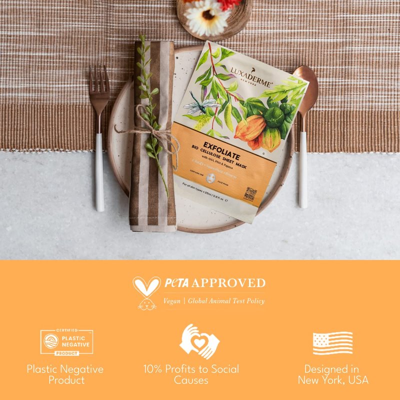 - PETA-Approved - Exfoliate Bio Cellulose Face mask set is a 100% natural and sustainable, cruelty-free moisturizing face mask that helps balance & purify your skin while preventing the formation of free radicals. It contains no parabens, phthalates, sulphates, alcohol, gluten or artificial colors and is approved by PETAs. Our hydrating sheet face mask are made in New York with all-natural ingredients to give you that fresh glow.