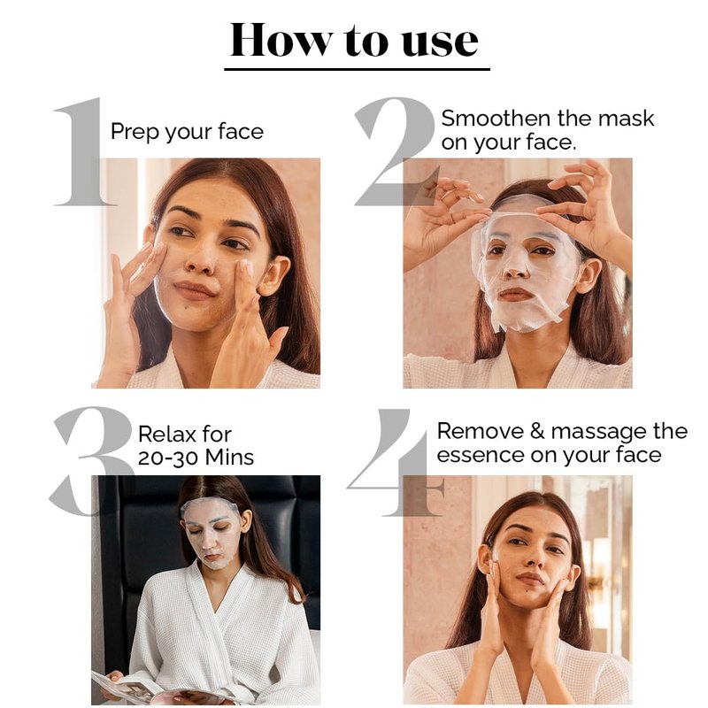 3.Position the anti aging face mask over the entire face. Smoothen the face sheet mask collagen on your forehead and work your way to the chin so that it seals evenly to the skin. The Detox Bio Cellulose sheet mask is durable and you can reposition it on the face if required 4. Now just relax for 20-30 minutes. Let the nutrients absorb into your skin to work its magic 5. Remove and discard mask. Do not wash face after application.