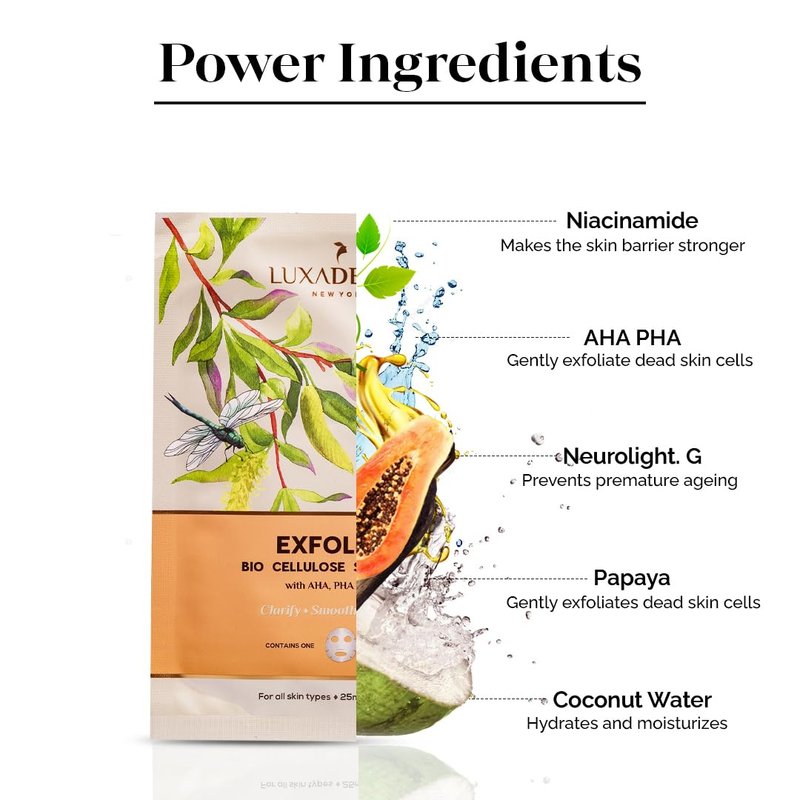 LuxaDerme Exfoliate Bio Cellulose Face Sheet Mask with Green Tea & Papaya Serum | Exfoliates dead skin cells resurfaces & moisturizes the skin | All skin type. 100% Fermented Coconut Jelly (Pack of 5)