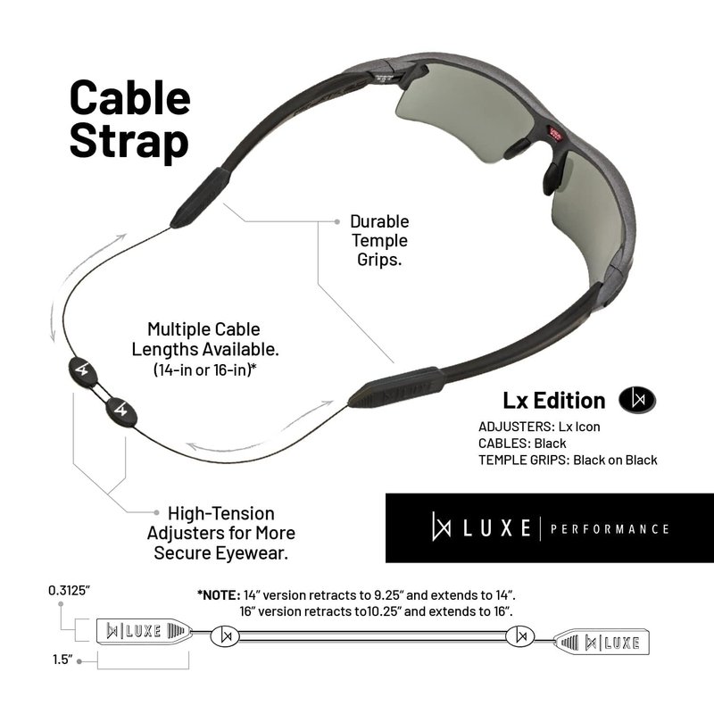 Luxe Performance Cable Strap Premium Adjustable No Tail Sunglass Strap and Eyewear Retainer for Your Sunglasses, Eyeglasses, or Prescription Glasses (Luxe Black 14")