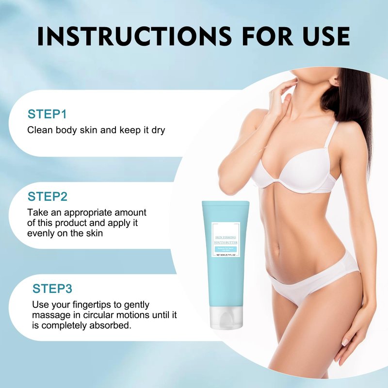 follow these simple steps: 1.Morning and night, gently smooth a thin layer of Skin Firming Youth Butter over your neck, legs, abdomen, arms, or any desired area for an enhanced lift and glow. 2.Use gentle circular motions to massage the butter into your skin, creating warmth for better absorption.