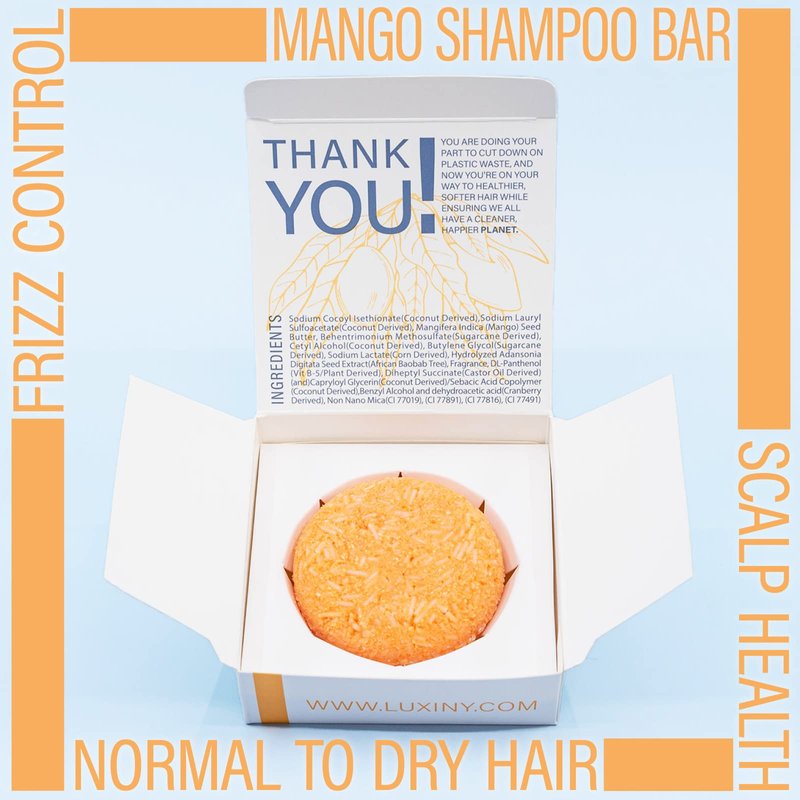 Tame your frizz. Luxiny's natural Mango Shampoo Bar will make your hair feel healthy and beautiful. Great for travel (TSA COMPLIANT) and will help you reduce plastic bottle waste. Luxiny's Mango Shampoo Bar will help tame frizz and give you a rich clarifying lather, free of harmful chemicals in liquid-based shampoos.