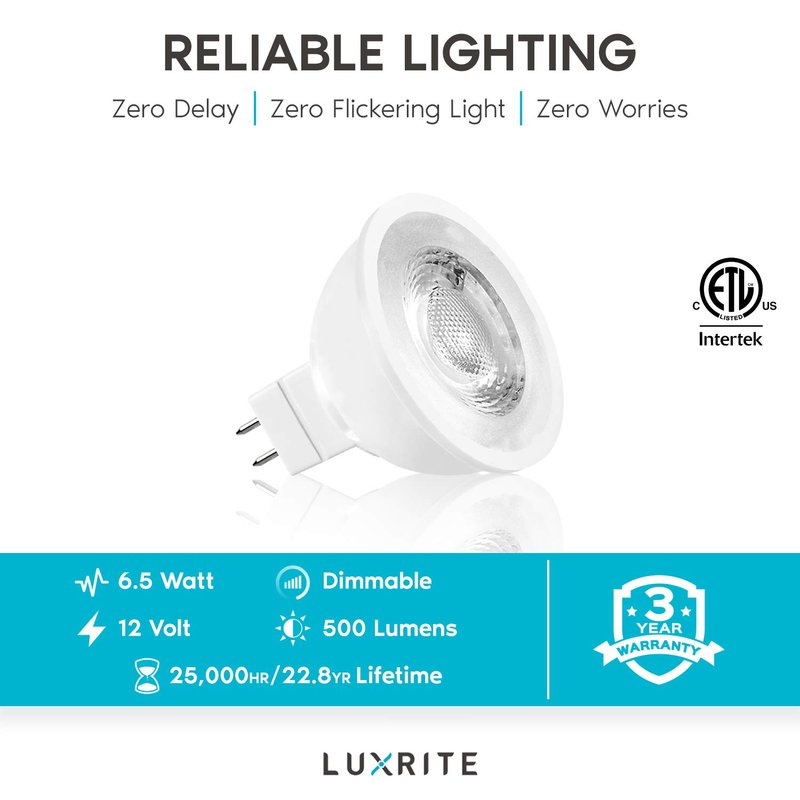 Luxrite MR16 LED Lighting - Offering you the perfect replacement to your standard halogen MR16 lighting. These mr16 gu5.3 LED bulbs will cut down your energy costs while still providing optimal lighting in all of your applications. Each 12V mr16 bulb can be utilized in a number of lighting fixtures for landscapes, kitchen, living room, office, home, accent lighting, and much more. Each light bulb is dimmable so you can control your lighting at all hours of the day. Get continuous light with no interruptions so you have light when you need it. Zero flickering, zero delay, zero worries.